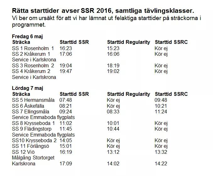 Starttiderna för sträckorna på alla resultatsidorna gäller för SM-fältet, dvs SSR. Om ni vill ha detaljerad information om Sydrallyt & Regularity så finns dessa nedan:Tidplan för SSR